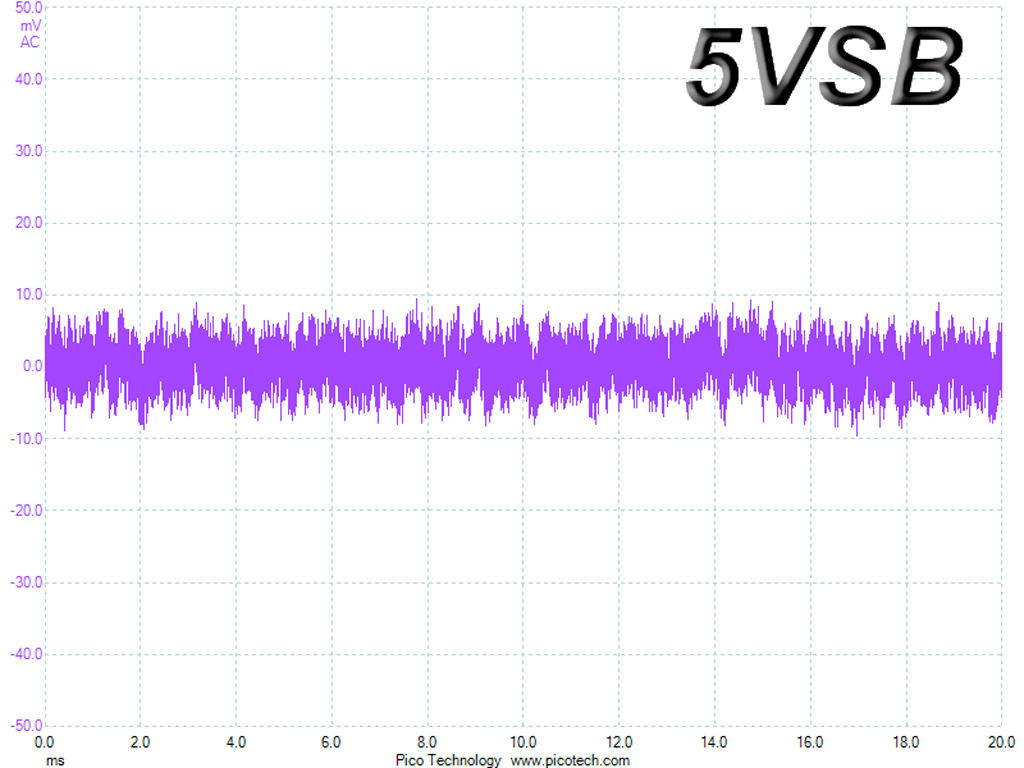 Ripple suppression is satisfactory on the +12V rail and good on the minor rails (5V and 3.3V). At 5VSB, ripple is a little higher compared to the other rails. But it's still much lower than the corresponding limit. Moreover, this rail just isn't that important. As long as its ripple doesn't exceed 50mV, you have nothing to worry about.