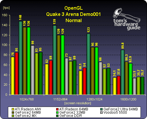 In 16-bit the AIW Radeon suffers badly like its big brother but it does handle things a bit better when 32-bit mode is toggled on. In any case, the AIW is definitely behind the 32 MB GeForce2 setup.