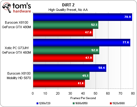 Enabling AA kills any hope of smooth game play in DiRT2, on any single-GPU notebook, at any widescreen resolution above 720p. The overclocked GeForce GTX 460M again falls into its customary position between the stock 480M and Mobility Radeon HD 5870.
