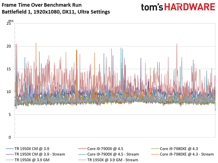Core i9-7900X does encounter a hiccup as its 99th percentile scores fall below Threadripper 1950X's during the streaming workload. The 1950X in Creator Mode also experiences some variance, with 20.38% of its frames falling below the 16.667ms threshold.