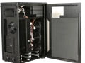 Article continues belowThe side, top, and front fans, at 230mm, 200mm, and 200mm respectively, are the color changers. There is also a 120mm rear exhaust fan. The side fan is on the left and comes out with the door. The vast majority of the case is porous for airflow.