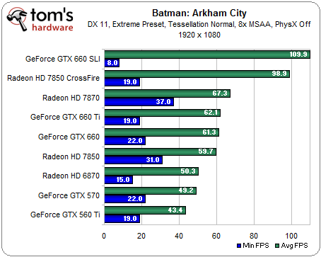 Of the eight games we're testing, two GeForce GTX 660s in SLI beat Radeon HD 7850s in CrossFire in seven.