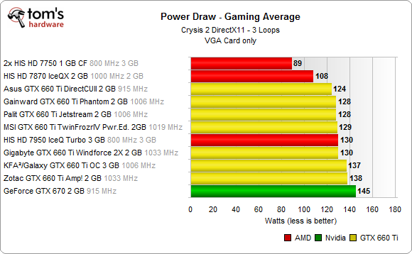 The consumption of two passively-cooler Radeon HD 7750s in CrossFire, operating at 1920x1080 with 8x MSAA is 98 W (102 W in Crysis 2). This is about 20 W less than Nvidia's GeForce GTX 660 Ti’s 118 W measurement (124 W in Crysis 2), and the GeForce was slower than the 7750s. The efficiency of Nvidia's GeForce GTX 660 Ti tanks once it's limited by memory bandwidth. Power consumption doesn't drop with frame rate. As a result, AMD's cards are as or more efficient at medium frame rates.
