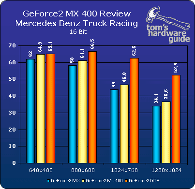 At 16 Bit per pixel, there is hardly a difference between the three GeForce2 models. At 1024x768 and above, the GeForce2 is still able to produce high frame rates thanks to its fast DDR memory. If it was possible to equip a GeForce2 MX or MX400 with DDR memory over a 128 Bit interface, I'm quite sure that it would not be too far behind.