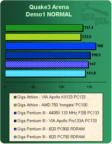 Quake 2 with its special 3DNow!-support would almost have been won by Giga-Athlon, if there wasn't this crazy old 440BX chipset. Coppermine is lagging behind Athlon on all 'official' platforms though.