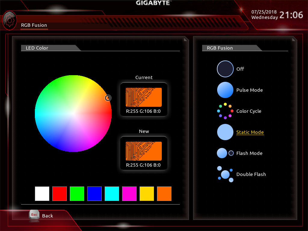 We’ve had mixed success with various vendors’ fan controller software, and Gigabyte’s Smart Fan 5 default fan control schemes are a little loud for our liking. Our Fractal Design fans can run very quiet, but this UEFI defaults the fans to max speed at lower temperature settings, so our provided fan curve proved to be quite effective in our testing. Your mileage--and preferences--may vary.. Another carry over from other AMD UEFIs, the board's RGB Fusion interface is effective in synchronizing the southbridge, audio isolation traces, and backplate shroud. The pulse mode setting is our light show of choice.