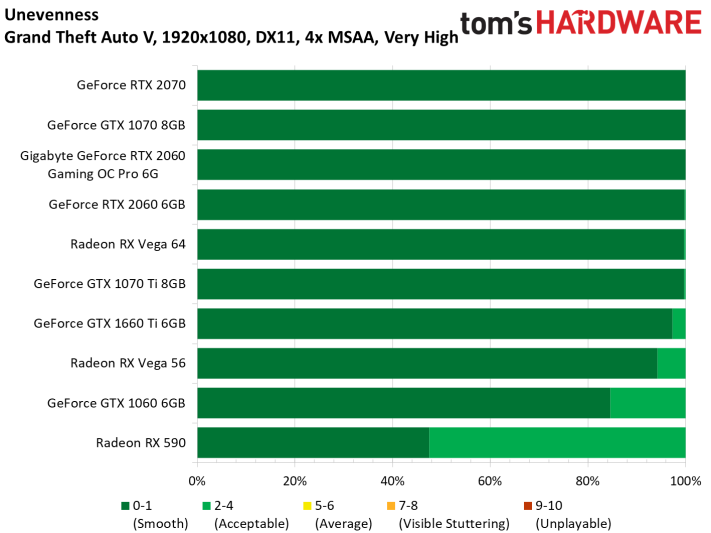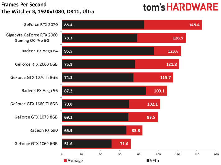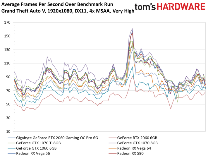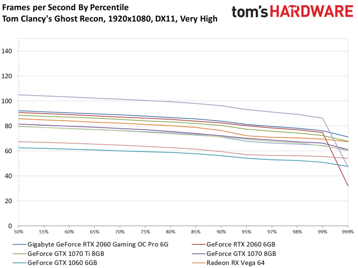 Through our benchmark suite, and despite taxing quality settings, the GeForce RTX 2060 Gaming OC Pro 6G serves up excellent frame rates at this resolution. It’s even quantifiably faster than GeForce RTX 2060 Founders Edition, achieving a geometric mean of 97.4 FPS versus Nvidia’s card at 94.9 FPS.