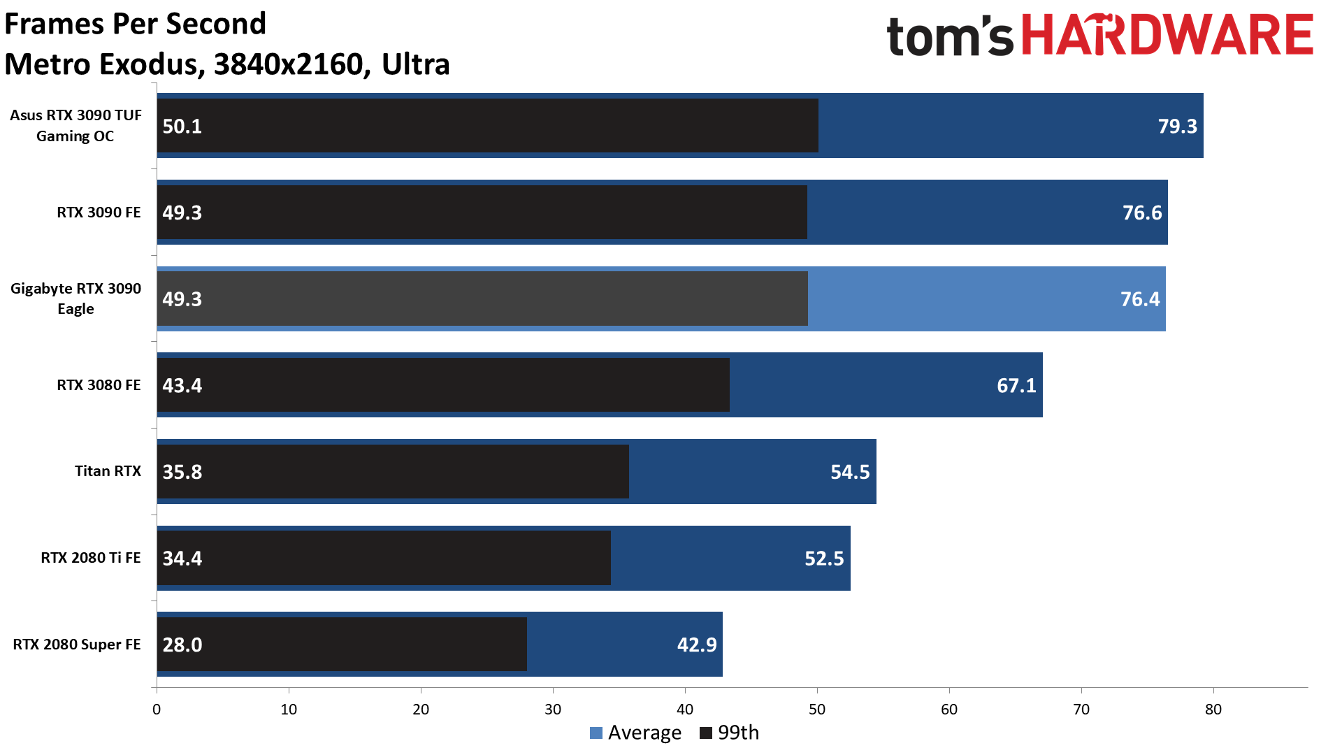 On average, the Gigabyte RTX 3090 Eagle uses 5-10W less power than the RTX 3090 FE. The gap is slightly larger in Metro Exodus and smaller in FurMark. Some of the other results are more interesting, though.
