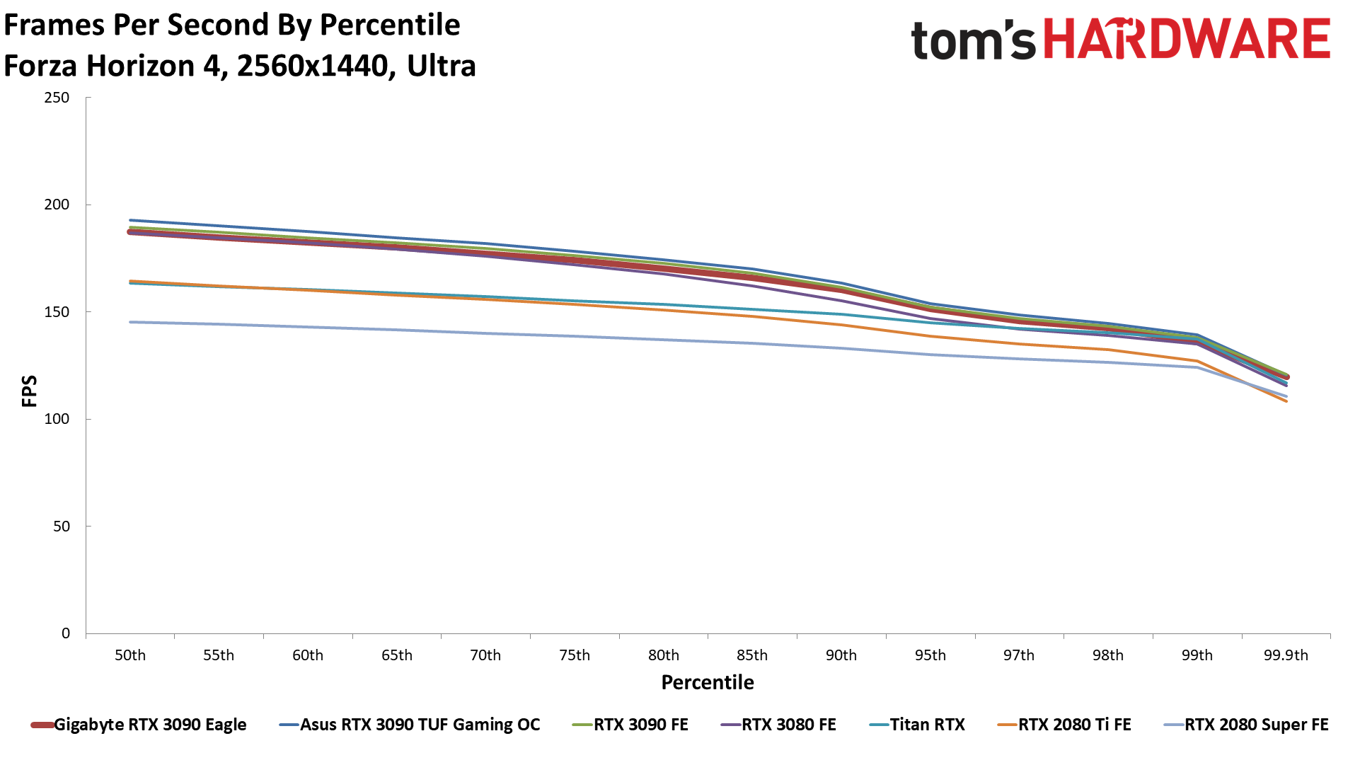 We have four charts for each of the games we tested: 4K Ultra, 4K Ultra Percentile FPS, 1440p Ultra, and 1440p Ultra Percentile FPS. Despite a small factory overclock, the Gigabyte 3090 Eagle ends up just a touch slower than the 3090 FE, likely due to the differences in power and thermals that each card targets.
