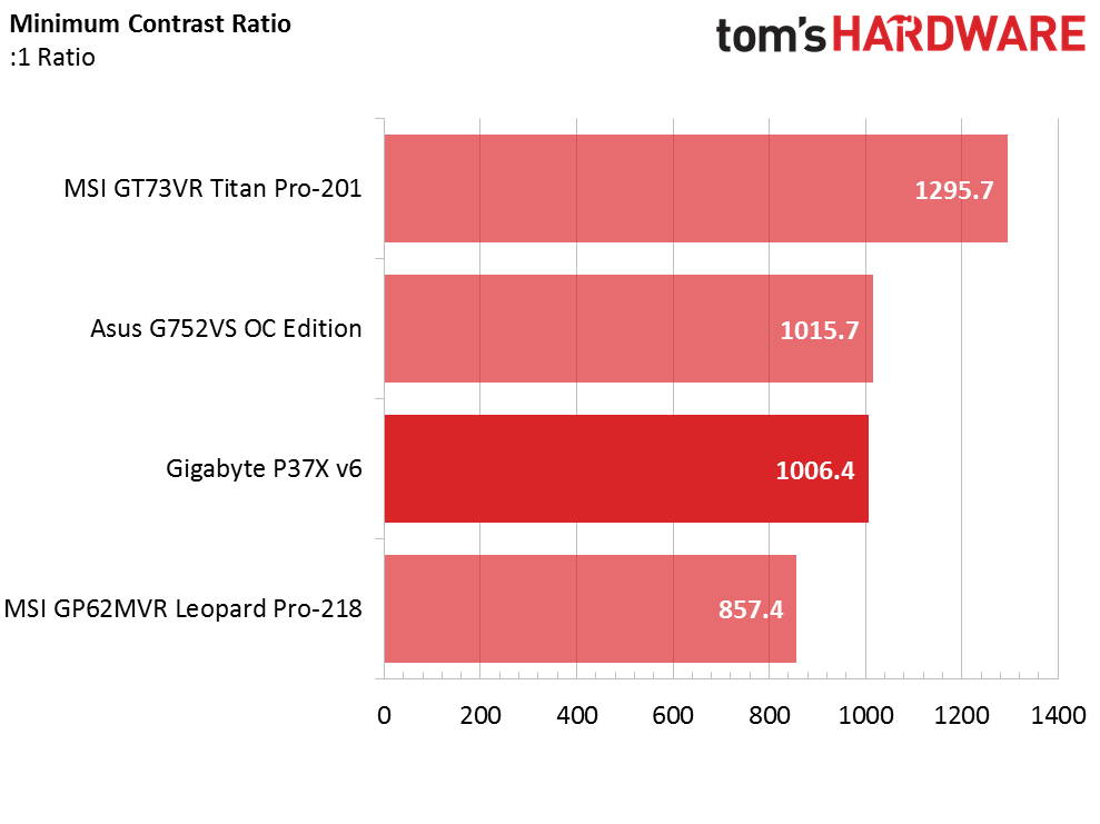 At 0% brightness, the P37X v6's display has a black luminance of 0.0143 cd/m2, a white luminance of 14.4406 cd/m2, and a contrast ratio of 1006.4:1. At 100% brightness, the display had a black luminance of 0.4336 cd/m2, a white luminance of 453.8345 cd/m2, and a contrast ratio of 1046.6:1.