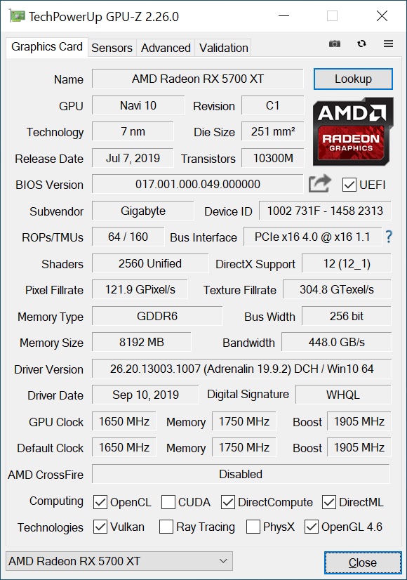 The Gigabyte RX 5700 XT Gaming OC 8G runs with the same Navi 10 GPU found in AMD's reference RX 5700 XT. The die contains 10.4 billion transistors and was manufactured using TSMC’s 7nm finFET process. This yields a die size of 251mm². Digging deeper, there are four RDNA Compute Units (CUs) and 64 Stream Processors for a total of 2,560 ALUs. Each CU has for texture units for a total of 160 TMUs.