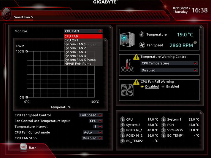 Though it also shows component status, Gigabyte System Information Viewer is the launching point for Gigabyte’s Windows-based fan control. Additional menus show system alert adjustments, a system status recorder, and even a popup for a screen side bar that shows all monitored readings.
