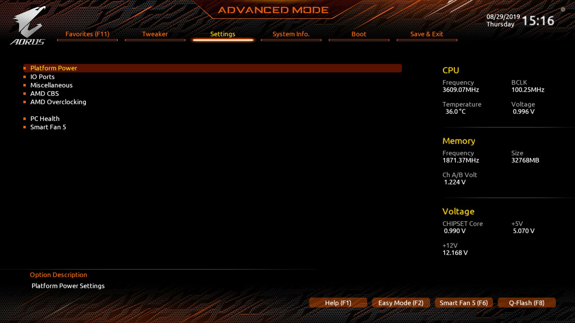 Sliding to the right, the Settings section is where adjustments can be made to platform power, IO ports, AMD CBS, as well as AMD’s own overclocking section that the company injects into board partner UEFIs. In addition to these options, here is where you’ll find PC Health as well as Smart Fan 5 for the BIOS.