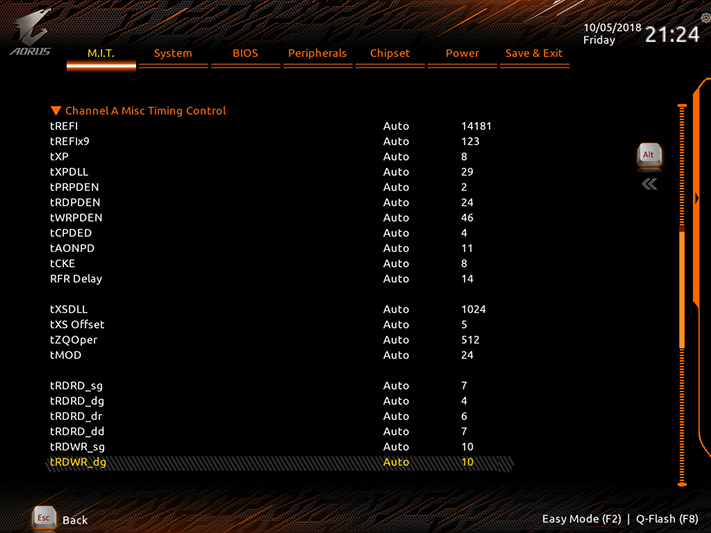 The Z390 Aorus Gaming Master firmware opens to an Easy Mode GUI which allows users to enable XMP memory mode, change boot order, select fan profiles, or select that 5.2 GHz programmed OC that didn’t work properly under AVX load from within its EasyTune application. Note that this programmed overclock will likely be altered when new firmware is introduced.