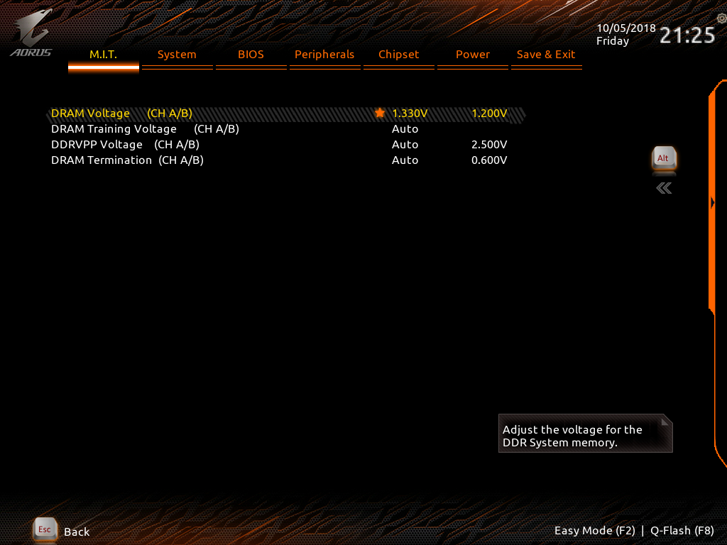 The Advanced Voltage Settings submenu of the Aorus M.I.T. firmware menu provides a list of additional submenus, including Advanced Power Setting, CPU Core, Chipset, and DRAM voltage levels. According to our power readings, a CPU Vcore Loadline Calbraition setting of “Turbo” does the best job of supporting our 1.30V CPU Core setting under heavy AVX load.