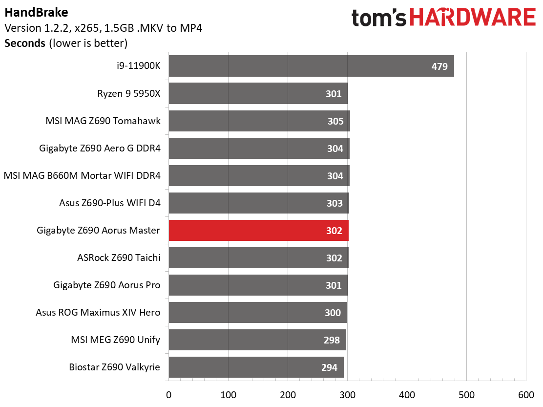 Corona testing was average, with the Aorus Master completing the test in 52 seconds and mixing with the DDR4 and DDR5 results. Moving on to Handbrake, the x264 test matched our fastest results at 112 seconds, while x265 was average. We didn’t see anything out of the ordinary in these tests.