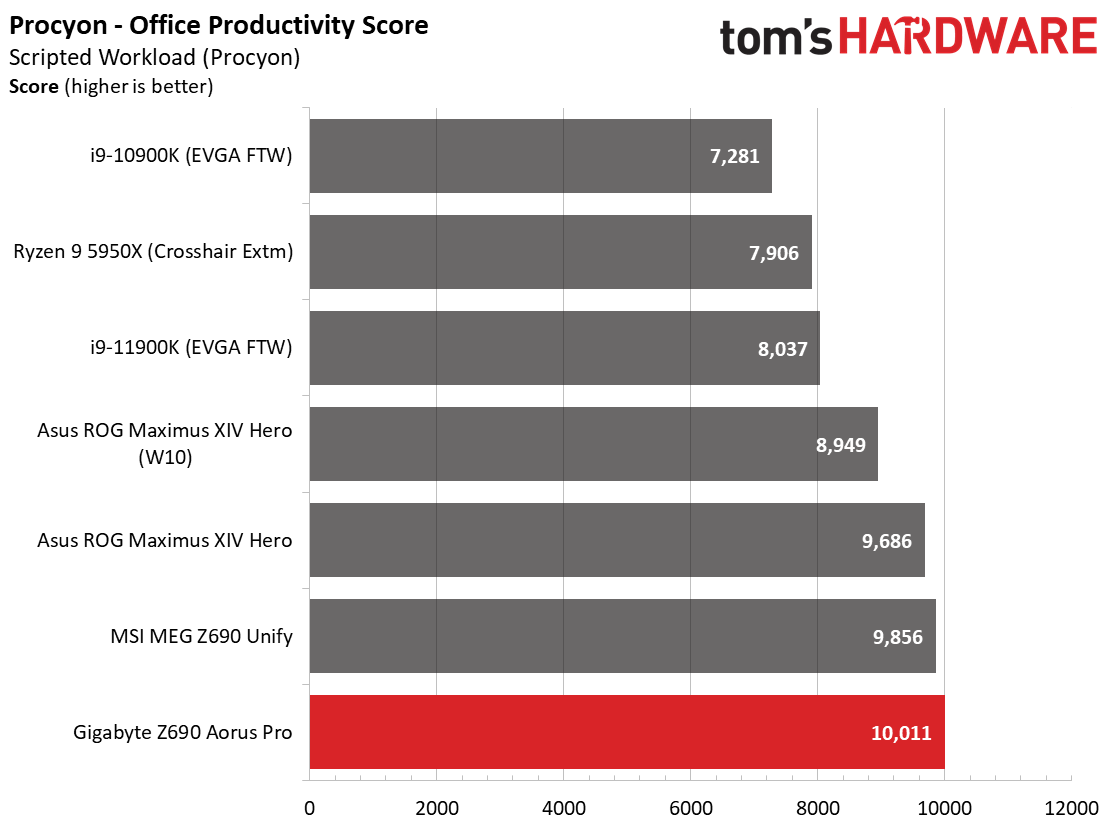 In UL’s Procyon Office benchmark, the Aorus Pro dominated, leading in every test. For the most part, the differences aren’t significant, but nonetheless, it’s a clean sweep. Procyon Video editing (Premiere Pro) was slower than the rest. In the Procyon Photo Editing benchmark (Photoshop/Lightroom classic), the Aorus Pro takes the lead, but here again, the difference in these tests between our Z690 boards is within the margin of error.