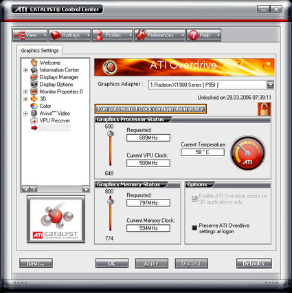 The default clock speeds are given as 500/594 MHz (GPU/memory) in the driver's information center. The overclocking presets in the Overdrive tab of the driver read out as 648/774 MHz. All of our X1900 XTX samples came with this combination of frequencies preset in the Overdrive section.