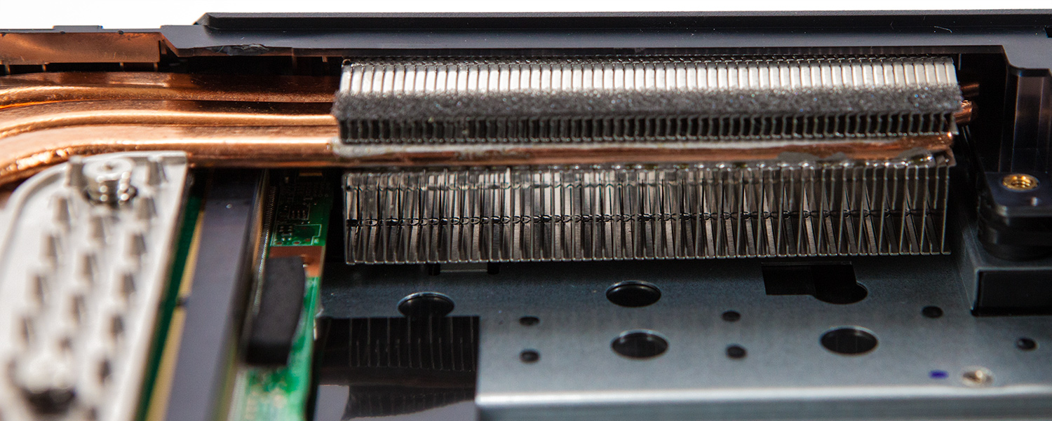 With the fan removed, we get a good look at the heat pipes. They all feed into a large heat sink that vents out the side of the machine.
