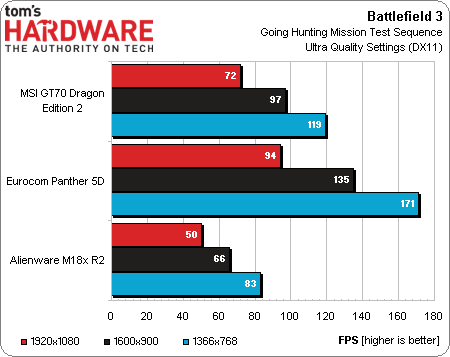 The single-player component of Battlefield 3 also shows that the MSI GT70 Dragon Edition 2 is capable of excellent frame rates with maxed-out settings. Once again, we see a notable performance advantage over one GeForce GTX 680M in the Alienware system, though the 780M still falls behind two 680Ms in the Eurocom machine.