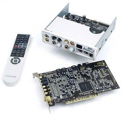 The two Creative cards are supplied with a traditional connector for a joystick and MIDI, which would occupy a second PCI bracket if installed by the user. The cards are equipped with an infrared remote control with a receiver on the external module or on the rack. This is very handy when using your PC as a DVD, video, or audio-player.