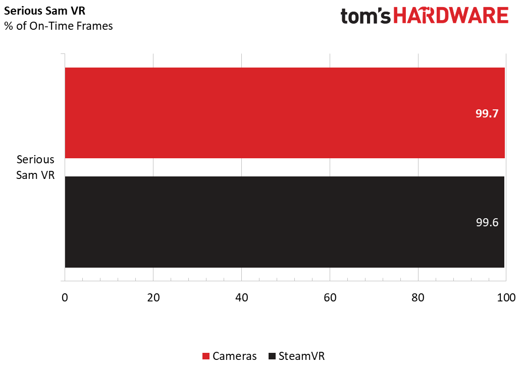 Serious Sam VR’s frame time results also tipped in favor of SteamVR tracking. Both configurations suffered less than optimal performance here, but the internal tracking system seemed to hurt us more than the external setup.