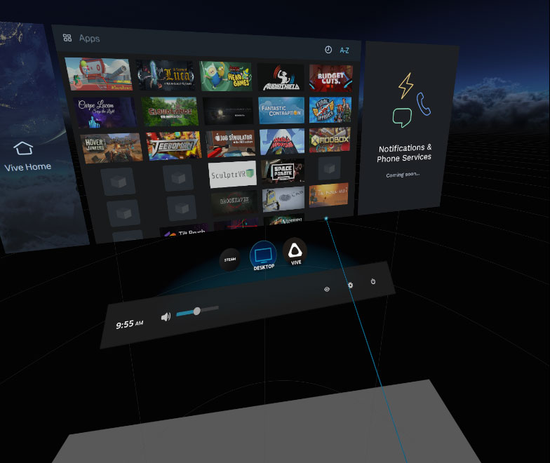 On the bottom of the overlay, you’ll find a volume adjustment slider, a clock, the settings menu and a power button that lets you shut SteamVR down. Directly above the lower menu bar, you’ll find options to switch from Steam to desktop view or HTC’s software interface.