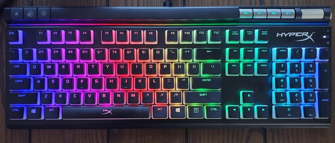 With its 3.4 pound weight, the HyperX Alloy Elite 2 shouldn’t slide around at all; this helped ensure the thick cable wasn’t a nuisance. Compared to other full-sized keyboards with dedicated media controls, the Alloy Elite 2 is on the shorter side at 17.5 x 6.9 x 1.5 inches. The Thermaltake Level 20, for example, is 19 x 7.3 x 1.7 inches and is also hefty at 3.3 pounds. Meanwhile, the Patriot Viper V765 and Roccat Vulcan 122 Aimo are both lighter at 2.5 pounds each (18.4 x 6.4 x 1.1 inches and 18.2 x 9.3 x 1.3 inches, respectively).