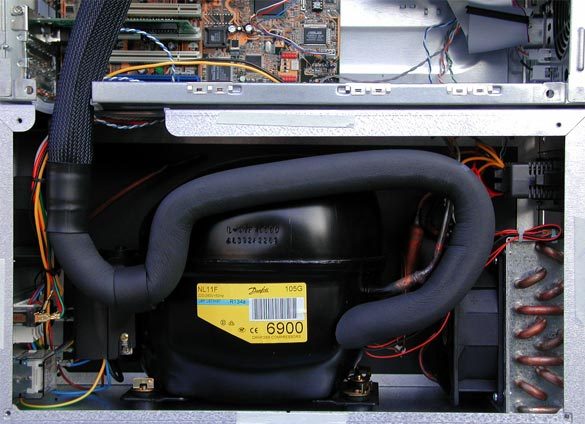 The cooling system consists of a cooling unit and a conventional PC tower case.