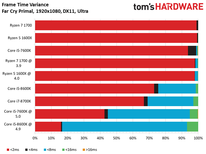 Far Cry Primal's Dunia Engine 2 responds well to high clock rates and IPC throughput, but it also seems to like it when we turn off simultaneous multi-threading. That means Core i5s enjoy an advantage over Core i7 and Ryzen processors. Core i5-7600K trails the -8600K by a large margin. However, it does beat an overclocked Ryzen 7 1700.
