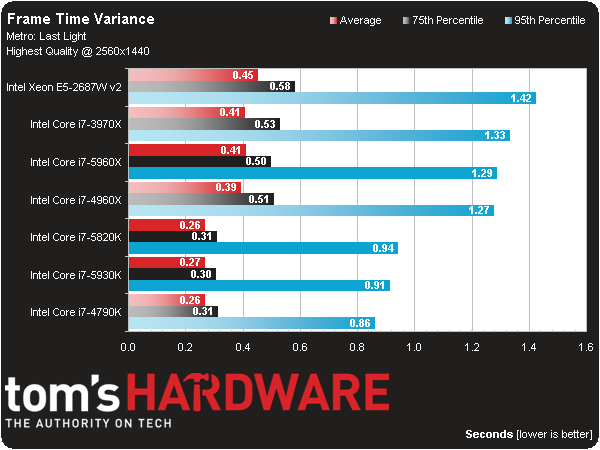 Even though Metro is a GPU showcase, we can’t help but notice the Core i7-5820K in first place again. The -4790K and -5930K following it are just slightly faster than three generations of Extreme Edition processors, plus a $2000 Xeon.