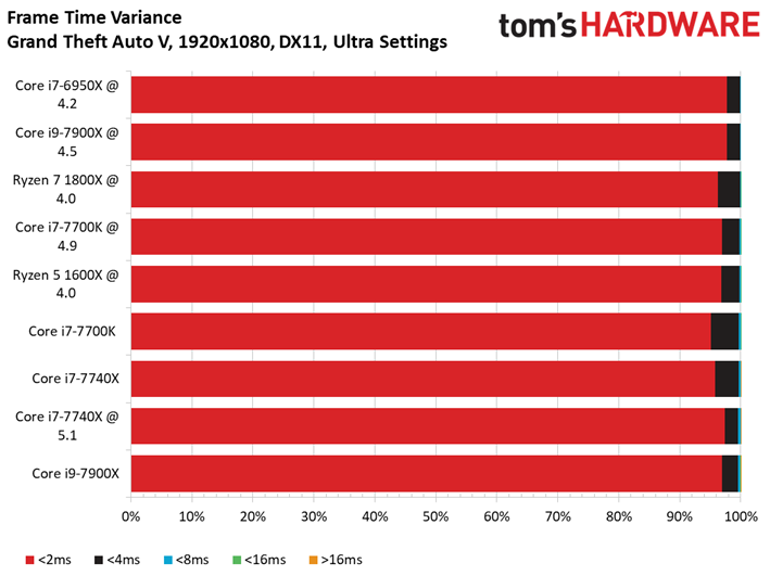 The Core i9-7900X is brutally competitive in this test, which runs counter to our expectations of Intel's massively-parallel HEDT CPUs that historically prioritize core count over clock rate. If the -7900X could consistently deliver this level of performance in all titles, it would be even more impressive.