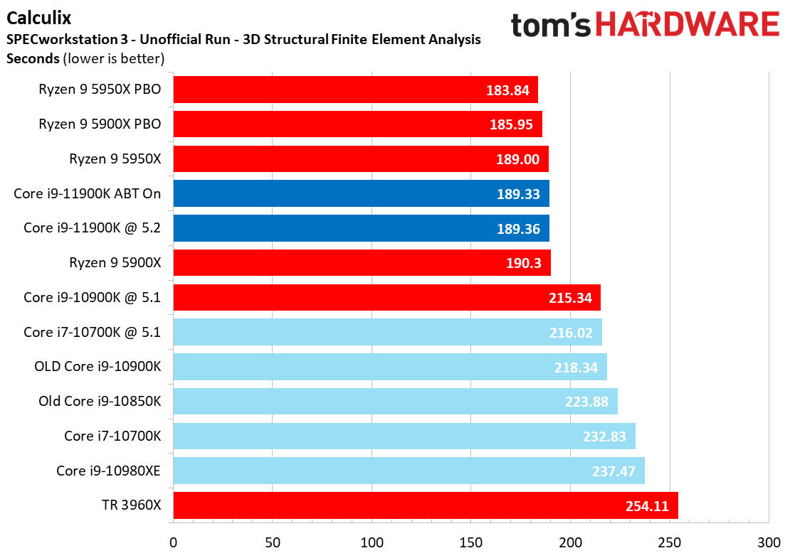 The previous-gen Core i9-10900K served as a popular CPU for many professional applications, so we took the Core i9-11900K through this battery of tests. The Core i5-11600K and Ryzen 5 5600X aren't as attractive for these types of workloads, so we left them out of the test pool. We also assume that most professional users will be savvy enough to enable ABT, so we only tested the stock configuration with the feature enabled.
