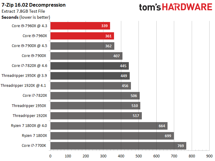 A chart-topping core count proves beneficial to the Core i9-7960X during our HandBrake and compression/decompression workloads. But the $1700 CPU stumbles during the LAME benchmark. Intel has confirmed that its mesh architecture can lead to performance regressions in a few applications, and it appears that LAME might benefit from optimization for the new architecture.