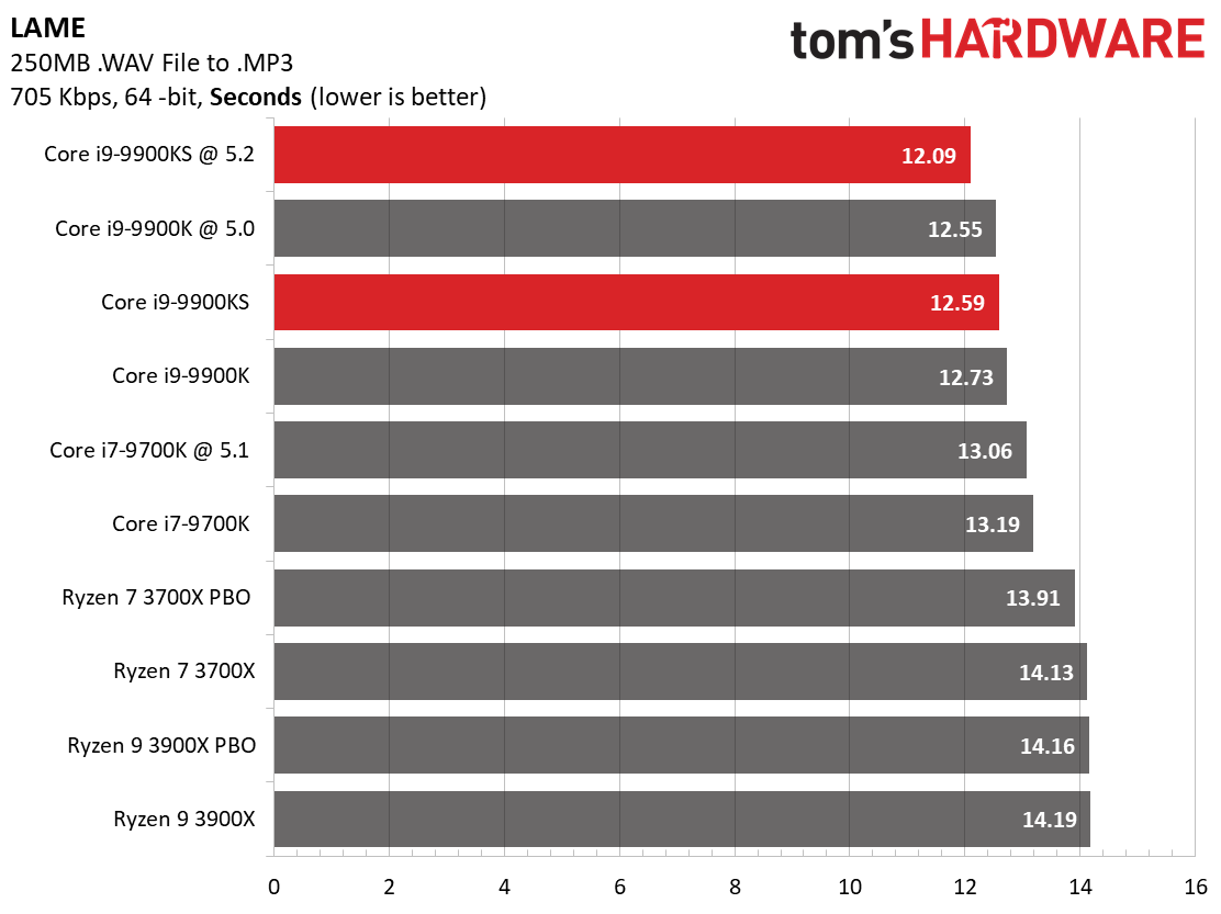 Our LAME and FLAC tests, like many encoders, rely heavily upon per-core performance. That means Intel's frequency advantage comes into play, handing the -9900KS the lead in both tests.