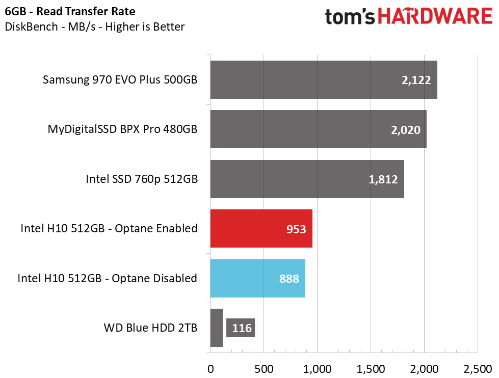 Intel’s H10 delivered some interesting results. To our surprise, the H10's Microsoft Office installation was about 30 seconds faster than any other drive in our test pool. Additionally, install times for both GIMP and Microsoft Office were about the same with Optane enabled or disabled.