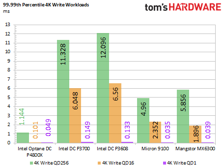 The average 4K read latency results are interesting, as they reveal the DC P4800X's tuning for low-QD workloads. The DC P4800X is brutally efficient at lower QD, but some NAND-based SSDs challenge it during unrealistically heavy loads. The 99.99th percentile 4K read chart shows the incredible read latency, which is staggeringly good from low to high QDs. The DC P4800X follows the same trend in the 99.99th percentile 4K write results.