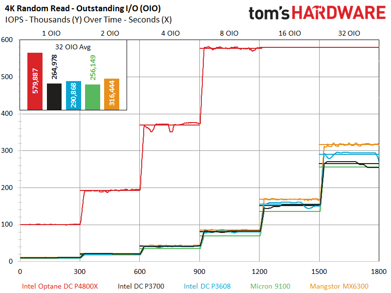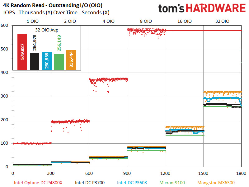 The 4K random read workloads are even more impressive. Intel's P4800X provides its maximum performance at eight OIO, whereas the regular SSDs don't hit their stride until they reach 256 OIO. The DC P4800X tops out at 580K IOPS. And while other SSDs are faster beyond 64 OIO, that doesn't mean much. They won't encounter such intense I/O in a real-world application.