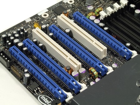 Intel's D5400XS motherboard features four PCI-Express x16 slots for graphics cards. Thus, buyers can create multi-card configurations using either Nvidia's SLI or ATI's Crossfire. Sadly, the spacing between the ports was poorly chosen, accommodating either up to three dual-slot cards or four single-slot cards. This is quite disappointing for a motherboard from the high-end price bracket. While it is true that neither graphics chip company currently offers support for four-card configurations today, the Skulltrail represents the ideal performance basis for just such a setup - and the same should hold true for the expandability and upgrade options. Sadly, this does not hold true for the current design.