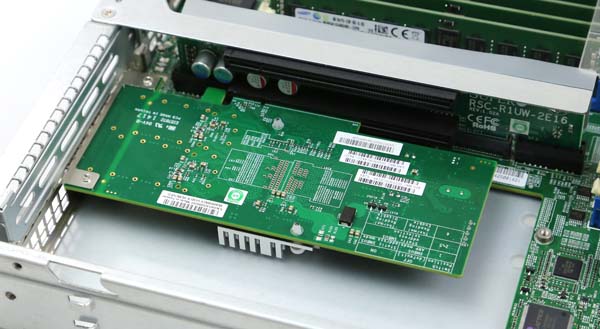 Inside the server there are two expansion bays. For testing, we used one of the PCIe riser's slots for Supermicro's Fortville-based dual 40 GbE adapter.
