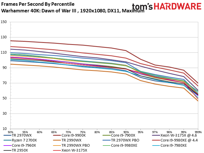 It isn't surprising to see the W-3175X excel in our Ashes of the Singularity: Escalation benchmark given its generally solid optimization for threading and the chip's hefty allotment of 28 cores. But again, it scores a near-tie with the less complex Core i9-9980XE in spite of its higher frequency and core count.
