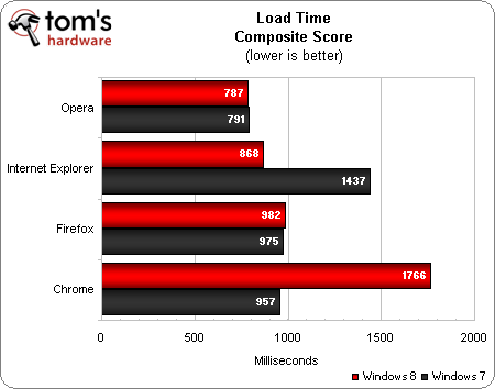 Opera takes the lead in the combined load time composite on both versions of Windows. This is no doubt thanks to its superior start times. IE10 places second on Windows 8, with third-place finisher Firefox closely in tow. Chrome tanks this test in Windows 8 due to its unusually high start times. In Windows 7, Chrome manages to place second, right behind Opera and ahead of Firefox, with IE9 in a distant last-place finish.