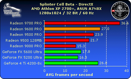 In Splinter Cell, the Radeon 9600 PRO performs very well, clearly beating the 9500 cards. The FX 5600 Ultra, on the other hand, scores very badly here. The Ti 4200's performance is once again a welcome surprise.
