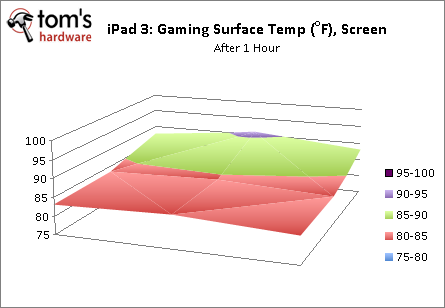 In the chart below we see the back of Apple's iPad 3 after an hour of gaming. It jumps as high as 105o on the rear of the case. But we have to imagine that very few folks game for more than an hour with a tablet in their hands.