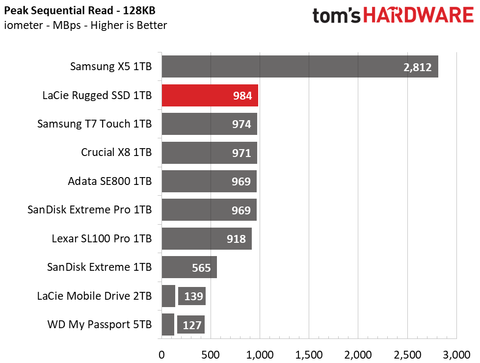 Up against the LaCie Rugged SSD, we put a whole assortment of 10 Gbps competitors. From Samsung, we included the new T7 Touch, as well as the Thunderbolt 3 enabled X5. From Lexar we added the SL100 Pro, another JMS583-based portable SSD. We also threw in SanDisk’s Extreme Pro and the older Extreme model. And, with value in mind, we included Adata’s IP68-rated SE800, as well as Crucial's X8, a QLC NAND-based competitor. Finally, just for comparison's sake, we added in a 5TB WD My Passport and a 2TB LaCie Mobile Drive, both HDD-based solutions.
