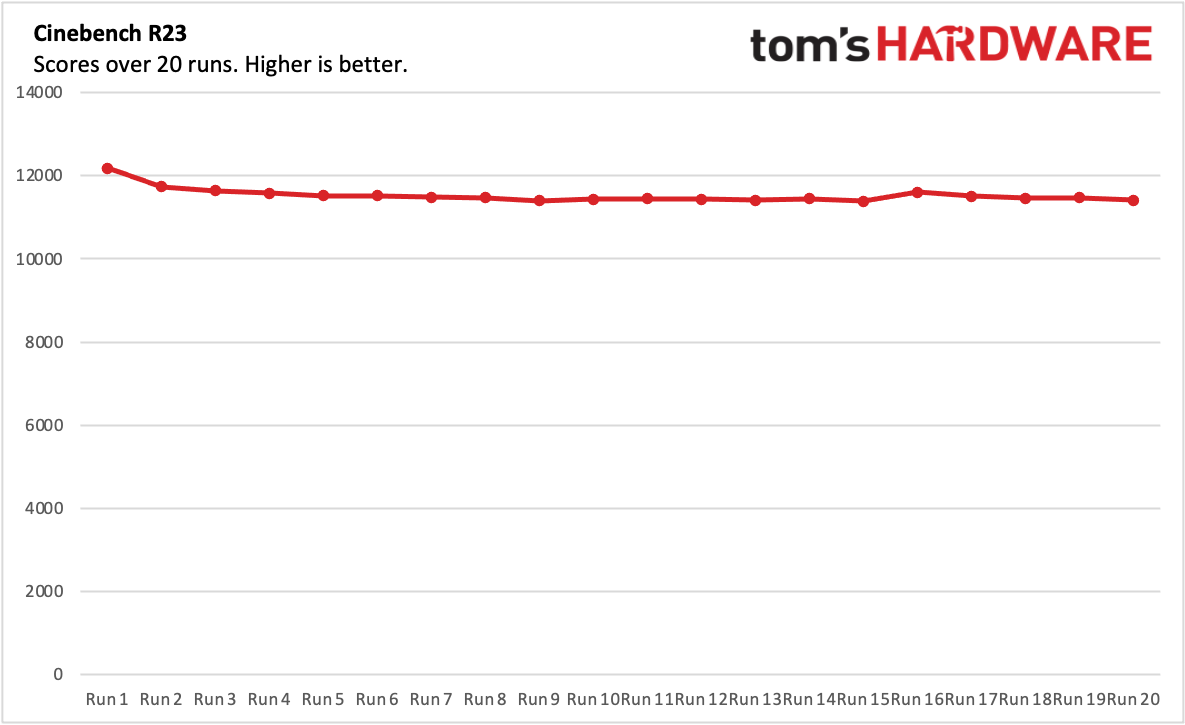 To stress test productivity notebooks, we run the Cinebench R23 benchmark on a loop 20 times. During this test, the ThinkPad X1 Extreme Gen 4 started with a score of 12,178.95 before dipping (as is usual) to a steady state in the mid 11,000's. The CPU ran at an average speed of 3.29 GHz, with an average temperature of 87.04 degrees Celsius (188.67 degrees Fahrenheit).