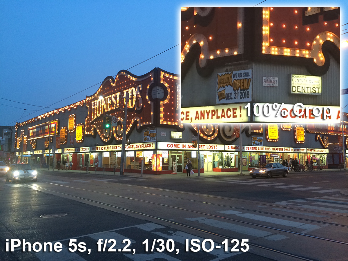 The Note 4 does really well, considering it has less light to work with. The image quality of the iPhone 5s and G3 is pretty similar. Both images have accurate color and similar amounts of noise. The G3 does capture the finer detail of the power lines and street signs better though.