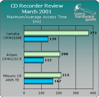 Although Mitsumi talks about 110 ms average access time, we measured 167 ms with CDX. Modern CD ROM drives require approximately 90 ms for average data access, making the Mitsumi writer a less suitable candidate if you are looking for something to replace your good old CD ROM reader.