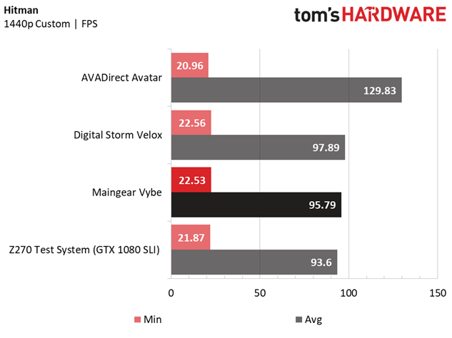 When we first benchmarked Hitman using DX12 and multiple GPUs (when we reviewed the Velox), we encountered some stability issues, so we resorted to testing the rig with multi-graphics support disabled. Although subsequent driver updates and game patches have alleviated much of these issues, we wanted to keep our data sets for this round of desktop reviews comparable, so we tested the Maingear Vybe in the same manner.