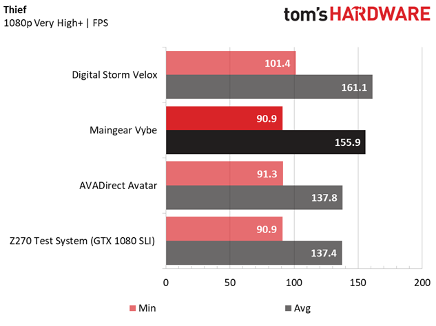 As an older game, Thief sees significant performance gains with higher clock rates, with the Maingear Vybe and Velox pushing far past our Z270 test rig and the Avatar. Although the Vybe again trails the Velox in average framerates by 5-6 FPS at all tested resolutions, it has no issues averaging above 90 FPS at 3840 x 2160.
